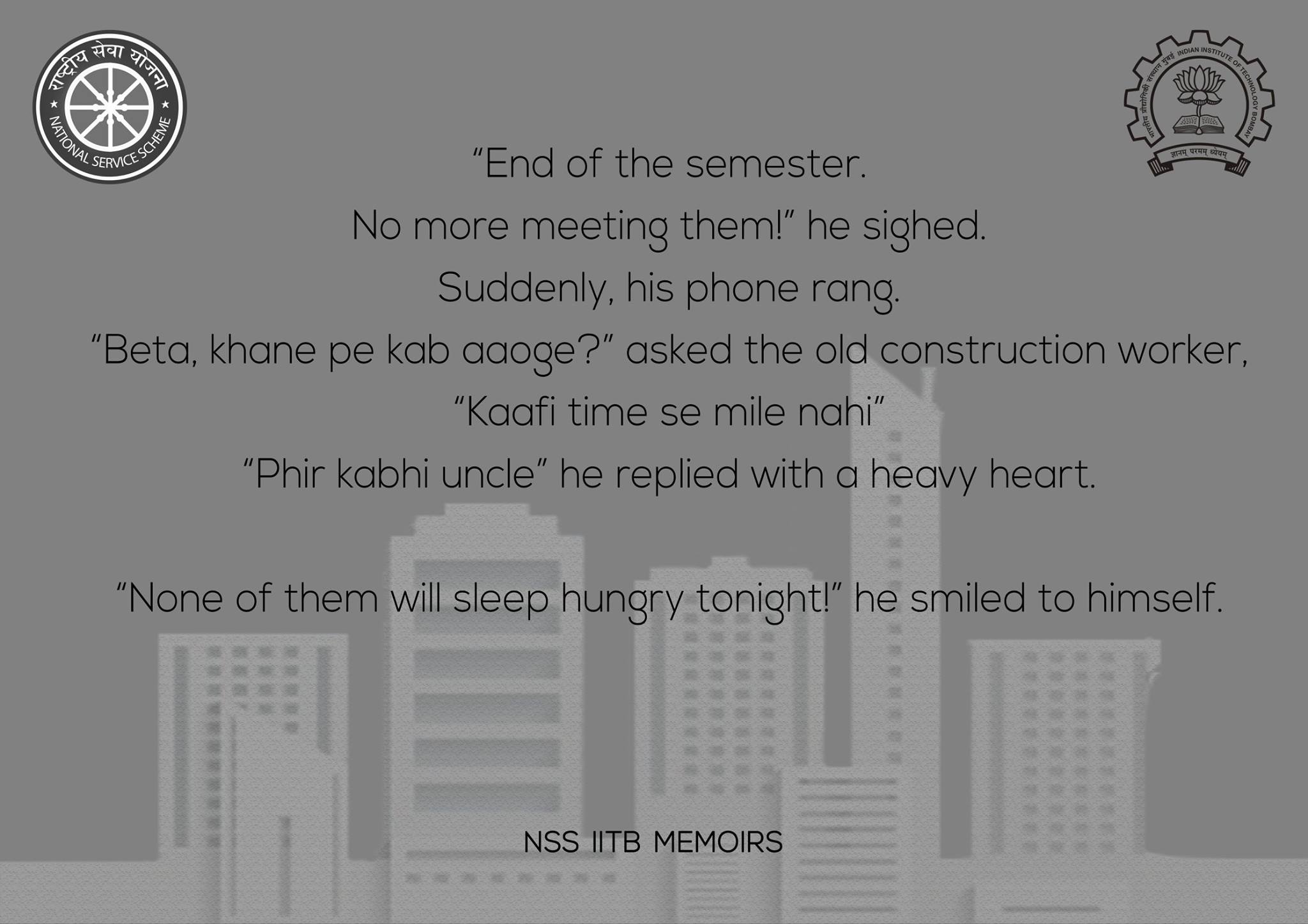National Service Scheme, IIT Bombay, being the largest student volunteer body, is the most active and perseverent organization in the campus in the field of social/community service. We provide opportunities for students to contribute their bit in the welfare of the society. NSS has 4 departments spanning all avenues of community service right from educating the underprivileged to innovating solutions to social problems using technology. Here are all the departments introduced briefly -