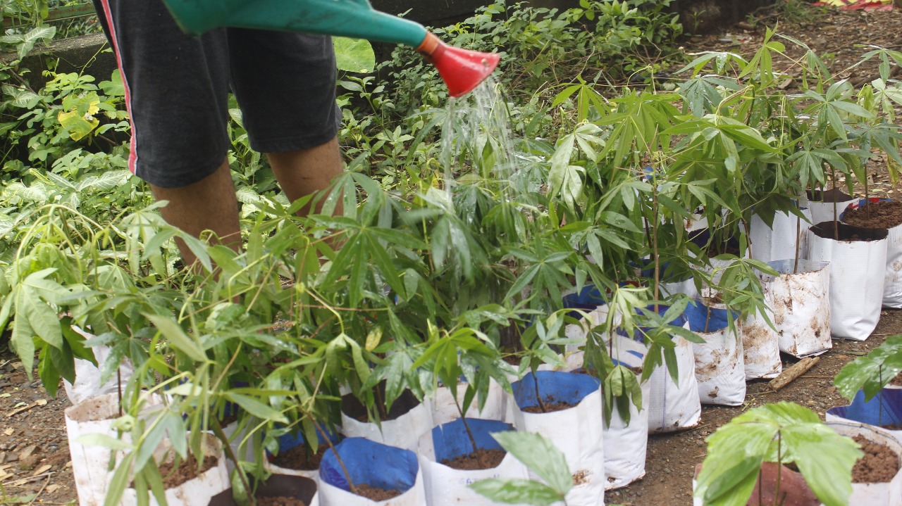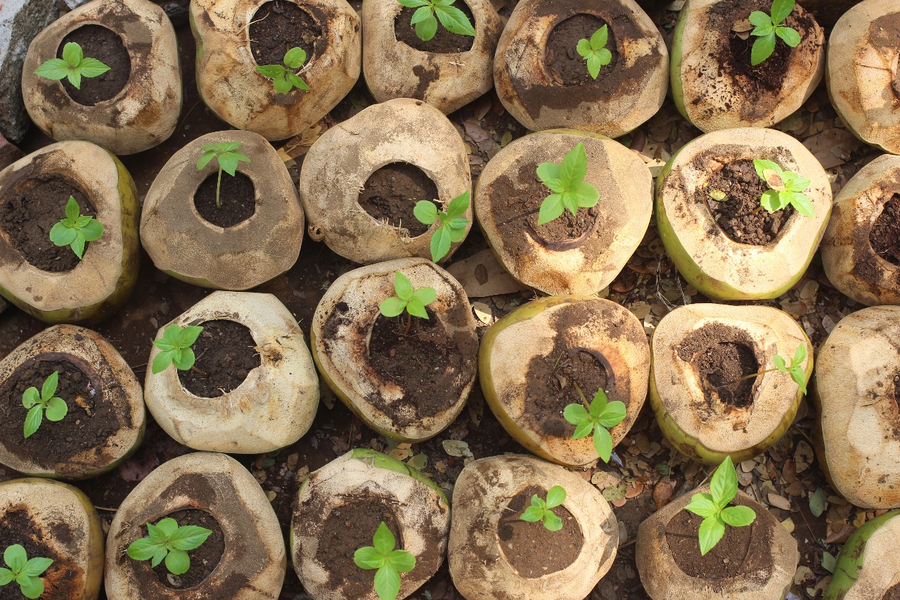 It is an unique way of plantation in which saplings were planted in the used coconut shells. Also when transplanted with the shell, the coconut degrades in the soil thereby providing nutrients. We collected more than 50 empty coconuts from the institute and planted Balsam saplings in them. In this process, we made holes in the bottom of the coconut, filled it with mud and planted the seeds or saplings in it. The holes in the coconut helped the roots to grow without any obstruction. This activity reduced the usage of the conventional black plastic covers in our Nursery thereby promoting sustainability.