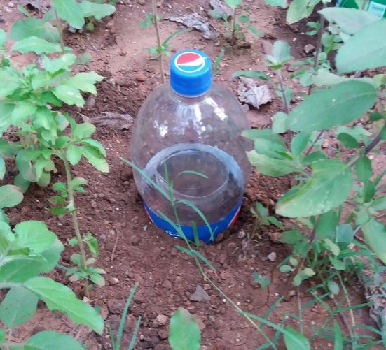 Aiming to conserve water and demonstrate the idea of smart irrigation, we implemented solar drip irrigation in the nursery.. In this activity, we used plastic bottles that were cut in half and kept inverted at various locations on the bed. After the beds were watered, the evaporated water from the beds got trapped in the bottles, got condensed and went into the beds once again. This helped to keep the bed wet for almost 2-3 days after the day of watering hence reducing the need of daily watering and saving water.